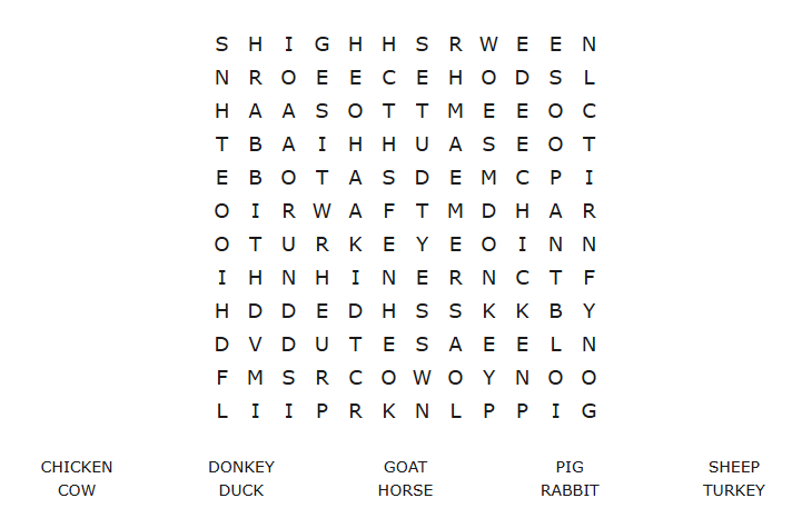 CHICKEN – COW – DONKEY – DUCK – GOAT – HORSE – PIG – RABBIT – SHEEP – TURKEY